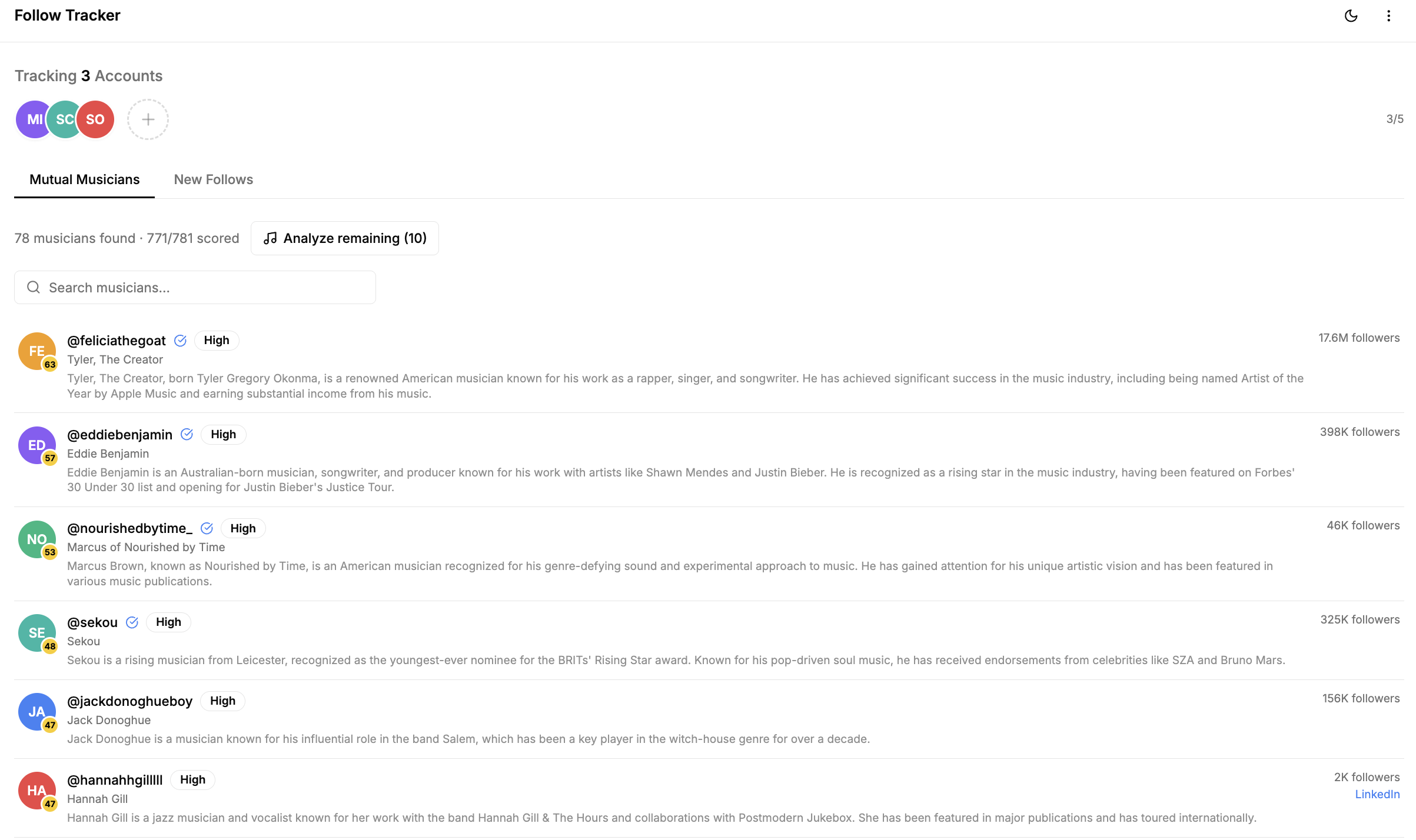 Choose any account and Doctrine tracks who they follow and unfollow, daily. Three A&Rs follow the same unsigned artist in the same week? You see it first. A competitor's CMO starts following five agencies? Now you know they're shopping.